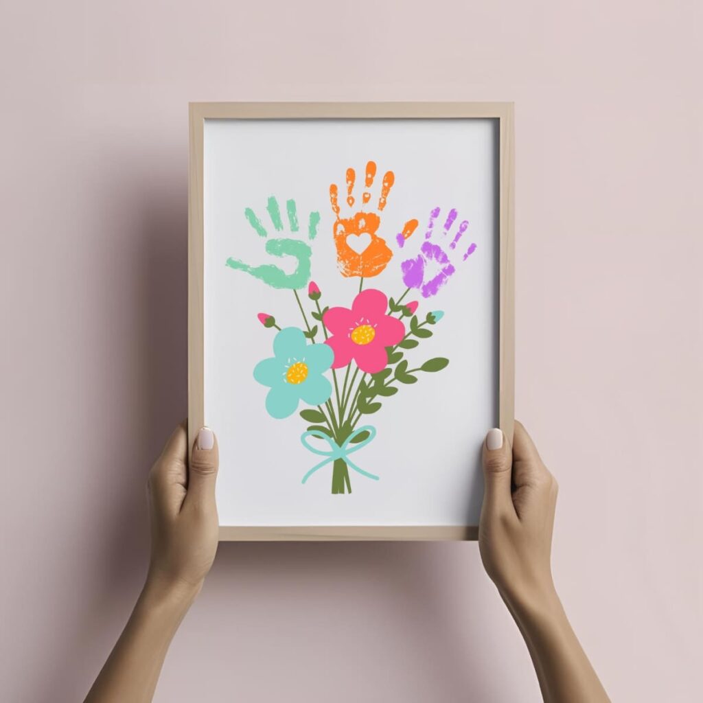 Este produto é um arquivo digital para imprimir e fazer um buquê de flores com carimbos de mão — um presente fofo e cheio de significado feito por crianças. 🌸
