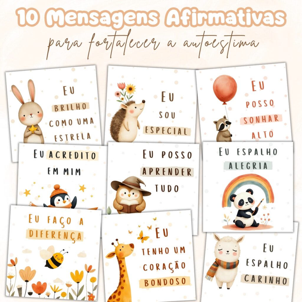 Este produto é um arquivo digital em PDF (tamanho A4) com 10 cartões de mensagens afirmativas para crianças. Cada cartão mede 7×7 cm e traz frases positivas para estimular a autoconfiança, o amor-próprio e a alegria. 🌈✨